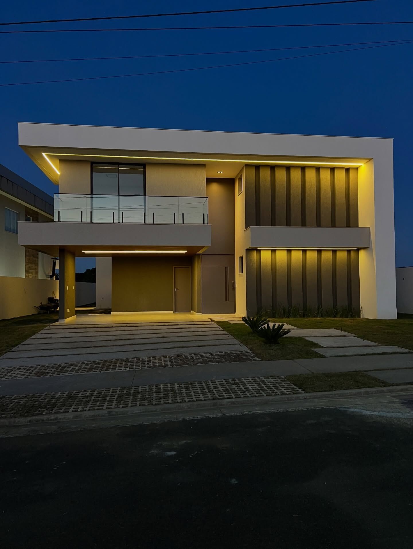✨ No pavimento térreo, tudo flui. Living amplo com pé-direito duplo integrando estar e jantar, cozinha espaçosa conectada à área gourmet, aquele circuito perfeito entre preparar, servir e aproveitar. Uma suíte de hóspedes completa pra quem chega ter seu próprio espaço sem invadir a intimidade da família e um quarto extra para escritório. Lavabo, despensa, depósito e área de serviço com quarto de apoio completam a praticidade.